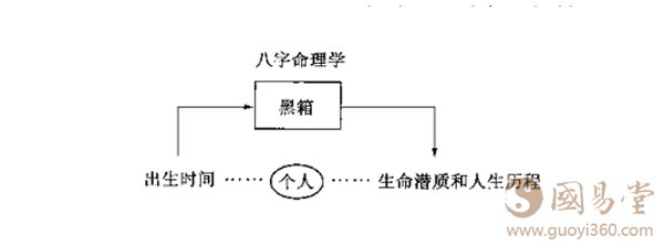 八字探索者假定每个人的出生时间跟他的人生经历之间,存在着某种联系。根据经年累月的观察,他们发现,这种联系不是杂乱无章、毫无规则可寻的。既然不是杂乱无序,那么,就可以认定其背后存在着某种“机制”,而这种联系正是受着这个机制的制约。这个机制就是上图中的“黑箱”。关于这个黑箱内部的真实的具体结构,谁也不清楚。但是,当输人某个人的出生时辰,它可以输出关于这个人的人生历程的某种近似的“描写和预测”。能作出这种描写和预测,就是这个黑箱所具备的功能。八字研究者就是从揭示这个功能下手的。传统命理学千百年来的发展历史,可以说,就是建构这个黑箱,使其具有这样的描写和预测的功能的历史。