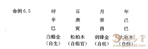 因此,按照季令,正是金旺、水死之时。显而易见,年柱纳音大林木是无法抵御月柱纳.音剑锋金的砍伐的。所幸的是日柱纳音松柏木,却是强木。年柱有了日柱强木的扶助,则不弱了。相反,月柱剑锋金倒显得势孤。恰好时柱纳音是白蜡金,可以声授月柱。这样,一方本弱主强;另一方则使弱锦强。双方对阵,正好势均力敌,强弱相等。