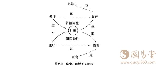 伤官定位后,食神就不难定位了。食神是直接克制七杀的。前文说过,“偏官即七杀要制伏”,食神正好具有制杀的功能,自然是善神。如图9.7所示,正印是克制伤官的,偏印是克制食神的。既然伤官是凶神,应当制约;食神是善神,不该克制,那么,制伤官的正印是善神,克食神的偏印(此时称枭神)则非善类,也是顺理成章的事了.